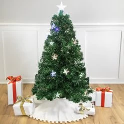 Pre-lit fiber optic tree has a multi-color wheel at base