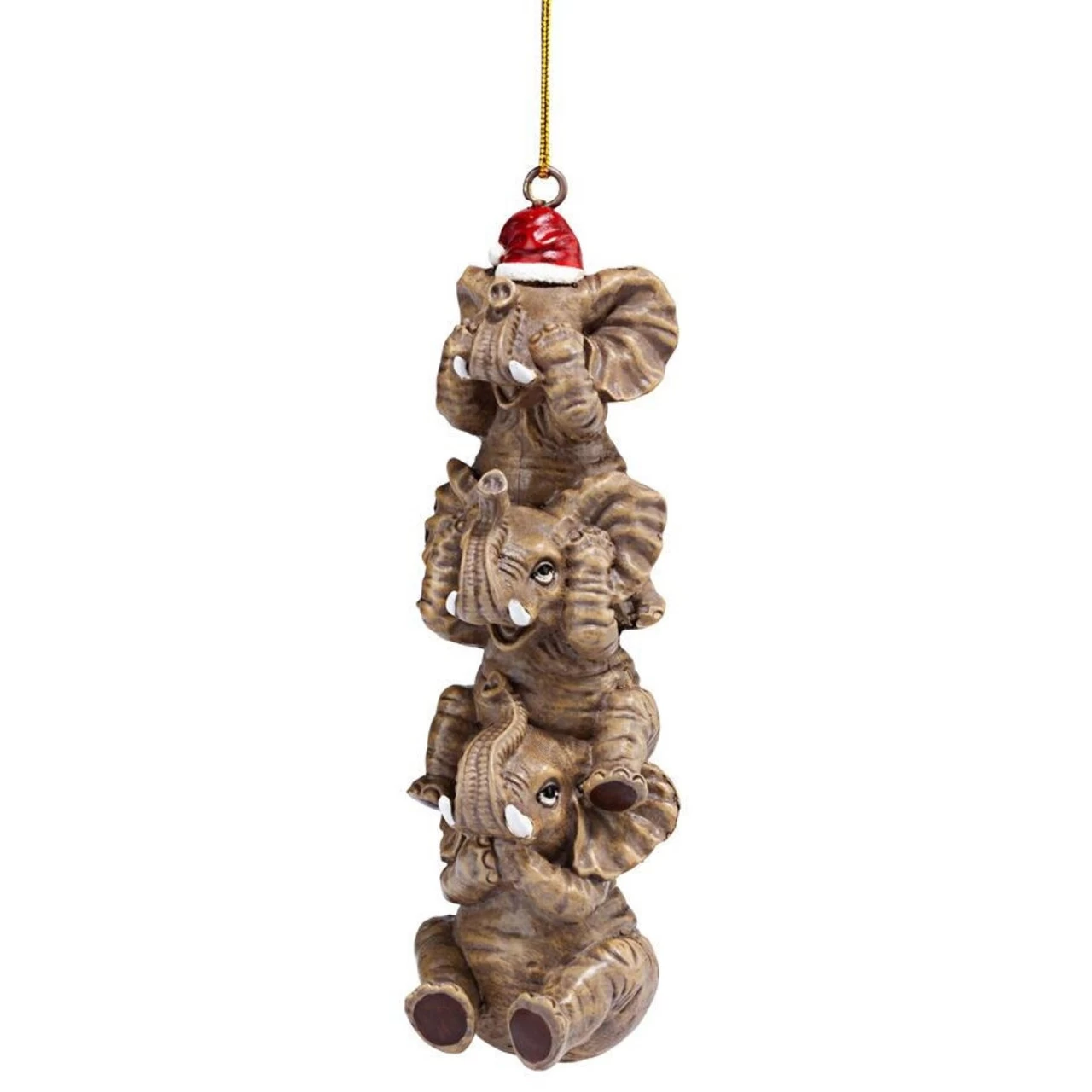 Features a hanging elephant Christmas ornament