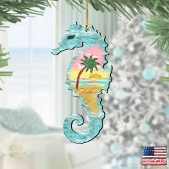 Set Of 2 Seahorse Beach Scene Wooden Christmas Ornaments 5.5″