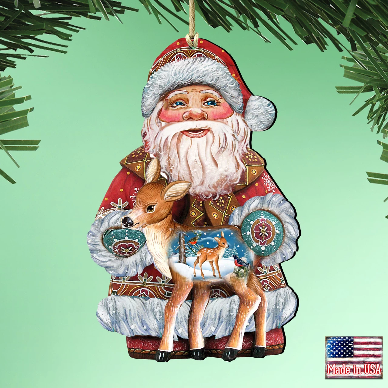 Ornaments depict Santa Claus holding a fawn with birds and another fawn image on it